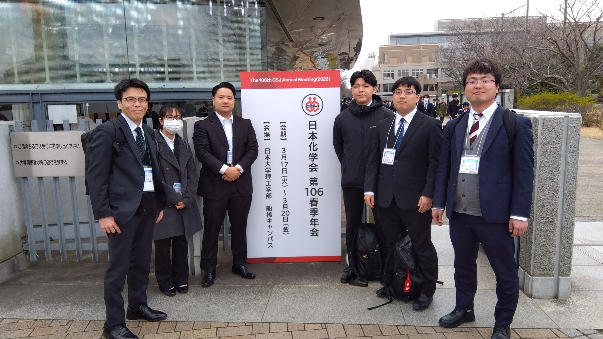 M2の諏訪さん、木内さん、笹崎さん、樋口さん、M1の石塚さん、原田さん、松岡さんが、日本化学会第106春季年会(2026) で口頭発表を行いました。